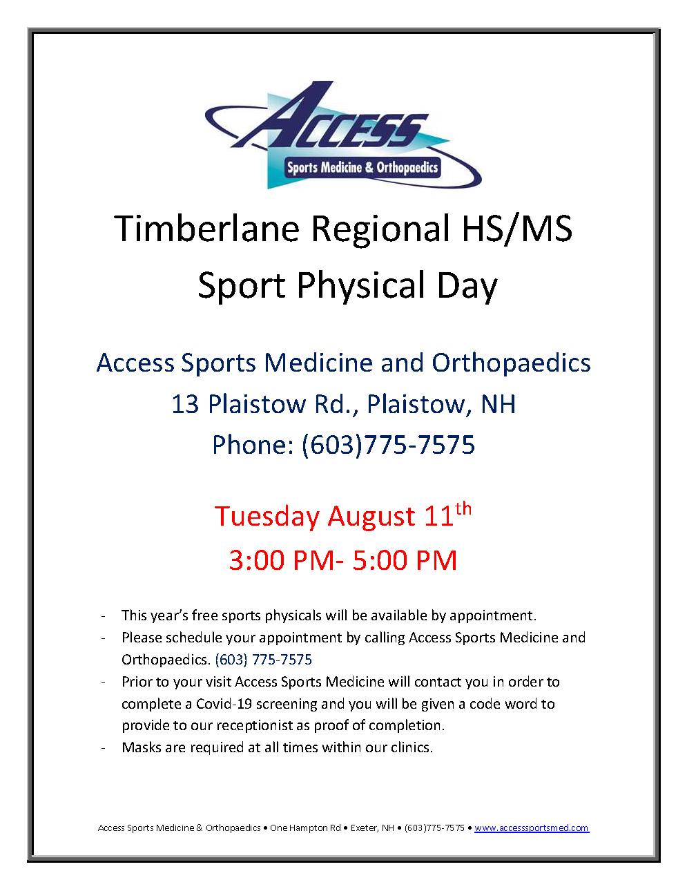 Timberlane High On Twitter Timberlane Regional Hs Ms Sport Physical Day Access Sports Medicine And Orthopaedics 13 Plaistow Rd Plaistow Nh Phone 603 775 7575 Tuesday August 11th 3 00 Pm 5 00 Pm Https T Co Liqgq1wxfp Twitter